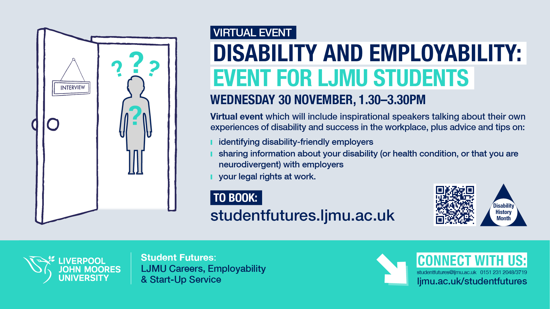 As part of Disability History Month, the Student Futures team are running a virtual session on Disability and Employability on Wednesday 30 November, from 1.30-3.30pm. The session, which is open to students from any programme or year group, will include inspirational speakers talking about their own experiences of disability and success in the workplace. The speakers are (subject to change):